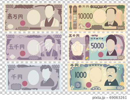 日本の新紙幣のイメージイラスト 円札 5000円札 1000円札 のイラスト素材